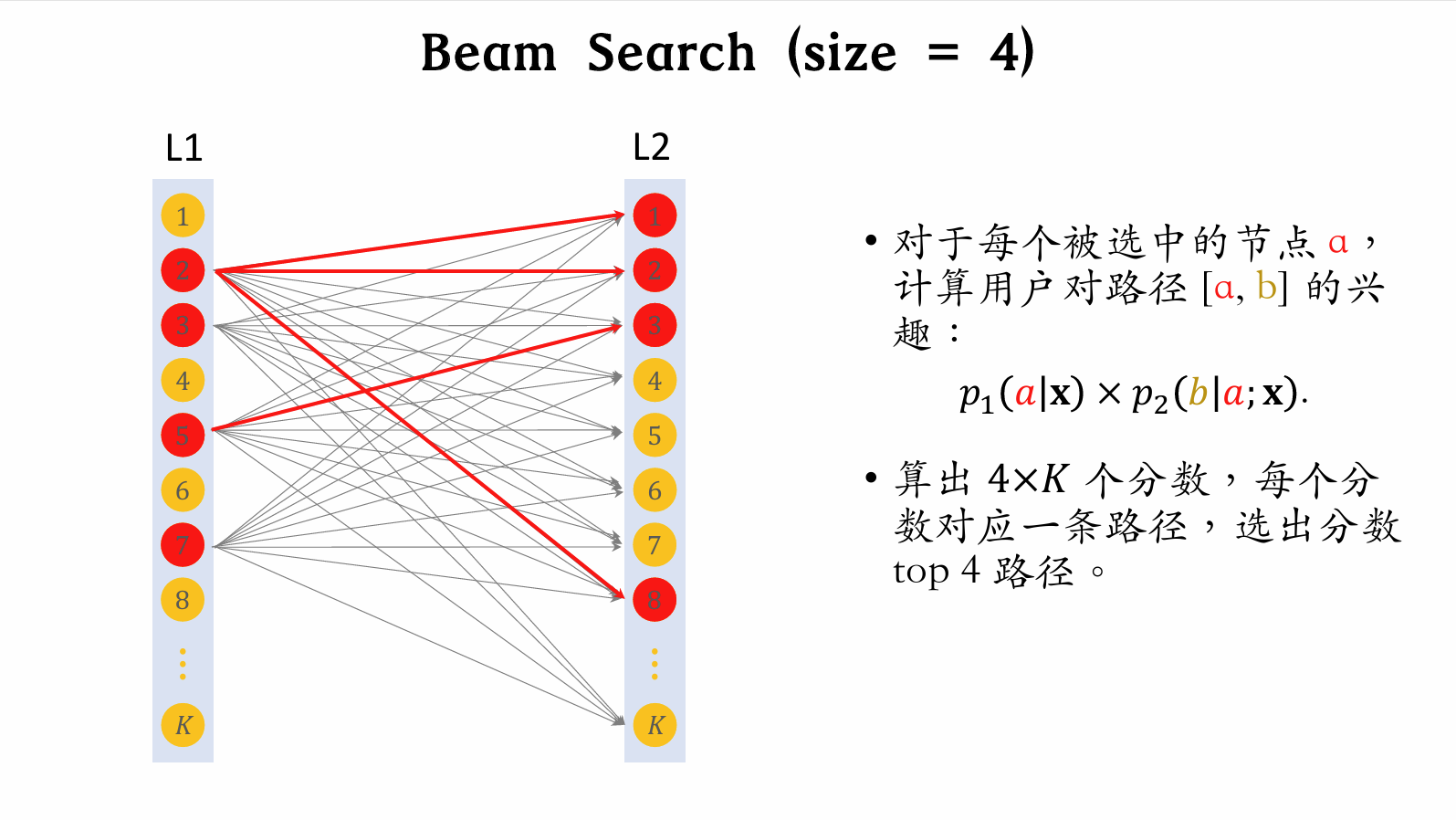 • 给定用户特征 x\mathbf{x},用神经网络预估用户对路径 path=[a,b,c]\text{path} = [a, b, c] 的兴趣,分数记作 p(pathx)p(\text{path} \mid \mathbf{x})