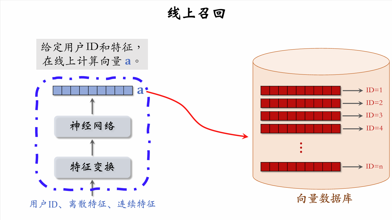 4. 返回分数最高的 100 个物品,作为召回结果。
